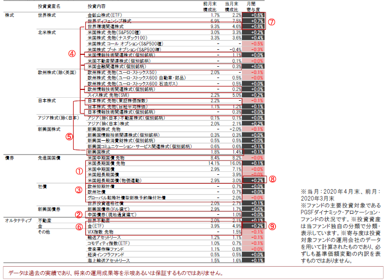 株式部分では、金鉱山株式や世界環境関連株式などを含む世界株式の寄与が大きくなりました(同➆) 。