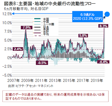 世界の中央銀行は、前例のない巨額の資金を金融システムに注入しています。2019年末以降、FRBだけでGDP比500ベーシス・ポイント(5%)相当の金融緩和を行っており、半分弱が利下げを通じて、残りの半分強が資産購入の形で行われています(図表8参照)。FRBは、必要ならば、追加緩和を行う態勢を整えています。ピクテのモデルは、同900ベーシス・ポイント(9%)の利下げ相当の金融緩和が行われる可能性を示唆していますが、これは、(グローバル金融危機を含む2014年までの)7年間に行われた金融緩和の総額を上回ります。
