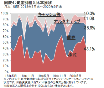 世界経済はV字回復に向けた動きを継続しています。しかし、新型コロナウイルスの感染再拡大に加え、米国における大統領選挙や財政の崖などの市場かく乱要因には注意が必要であるという考えのもと、株式の一部をバランス良く債券やキャッシュなどに振り替えると同時に、各資産内でも分散を重視した銘柄選択によりリスク量を抑制します。