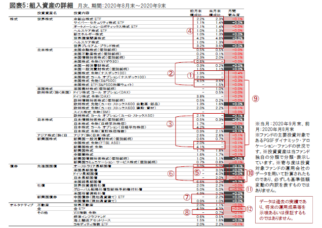 債券部分では、ポートフォリオのリスク耐性を強化する為、日本やドイツ、英国の長期国債を新規に買い付けた他(同➄)、既存のオーストラリアや米国の国債については追加購入しました(同⑥)。 その他、中国債券(現地通貨建て)ETFを新たに購入し、新興国債券の組入れを引き上げるなどしました(同➆)。
