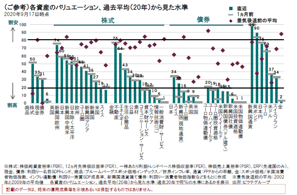 米国株式は、とりわけ割高に思われます。足元のバリュエーションは、予想利益ベースのPERが約25倍に達しています。こうした割高なバリュエーションは、ディフェンシブ銘柄に対する景気循環株の極端な評価に反映されています。この状況は、(シティグループが算出する)エコノミック・サプライズ指数が100以上の数値を維持してきたことで支えられてきましたが、同指数は、横ばいに転じ始めているように思われます。