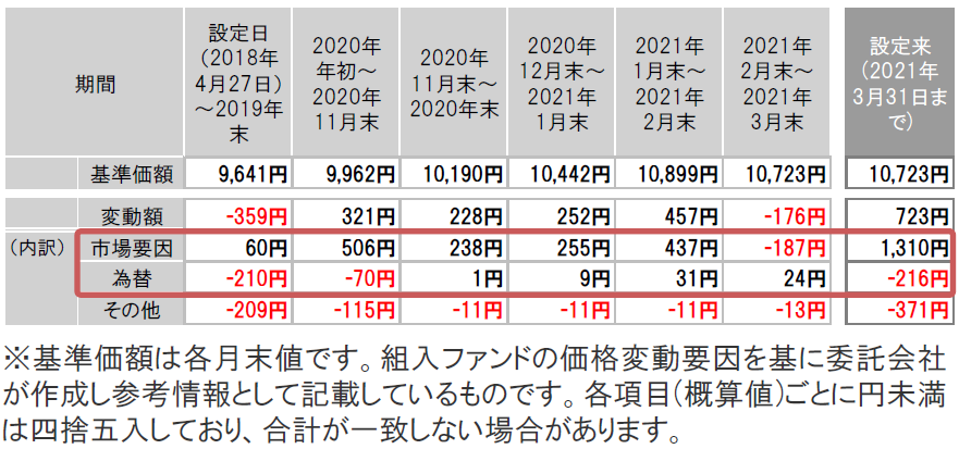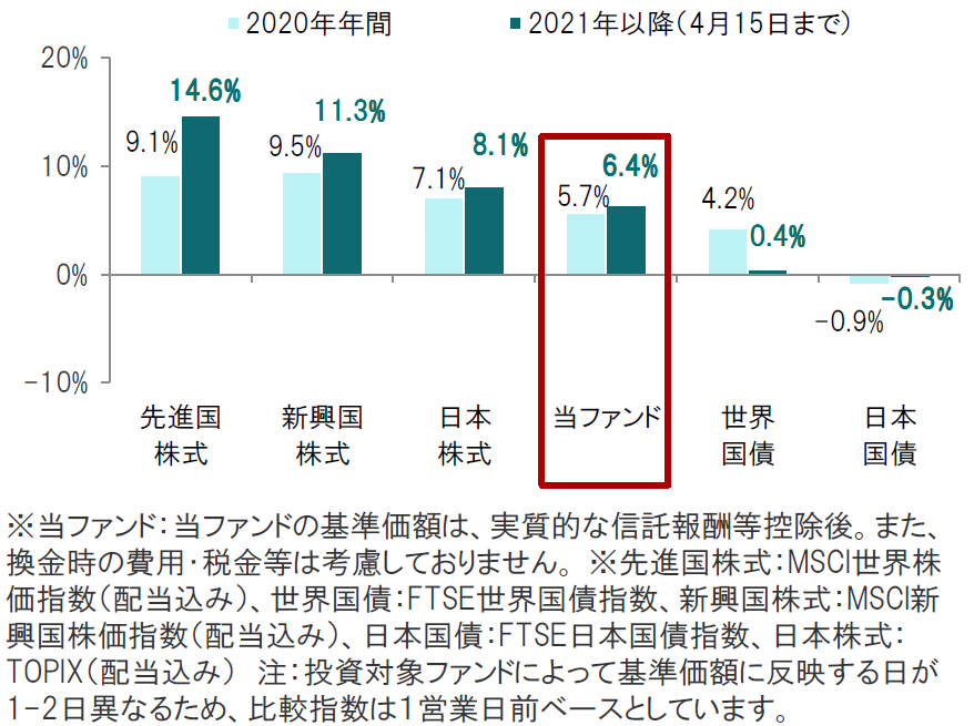 当ファンドの基準価額動向をみると、2020年3月23日を底に株式市場が反発し、その後も回復基調が続いたことから2020年年間では2019年末比でプラスのパフォーマンスとなりました。2021年年初以降も、株式市場の堅調な推移を背景に、4月15日の基準価額は10,842円と年初来で6.4%の上昇となっています(図表1、2、3参照)。