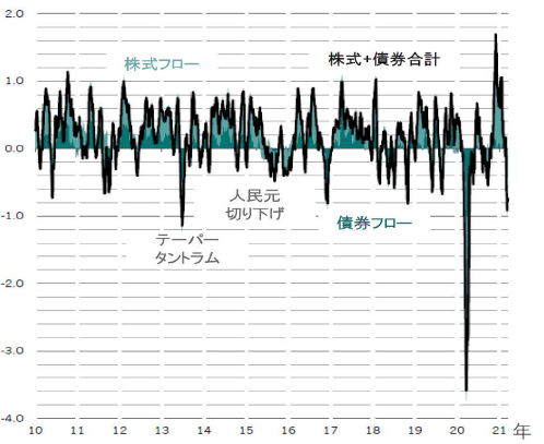 また、先進国の中央銀行による流動性供給の縮小から、どのような影響を新興国株式市場が受けるかどうかは定かではありませんが、(FRBが資産購入の縮小計画に言及したことが市場の急落をもたらした)2013年のテーパー・タントラムに先立つ時期と比べれば、新興国の経常収支は、総じて、改善されていると考えています。ただし、新興国の株式市場から、資金が流出していることにも留意する必要があると考えます。