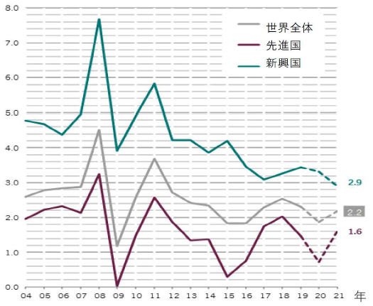 図表8:主要地域のインフレ率実績と2020~21年予想