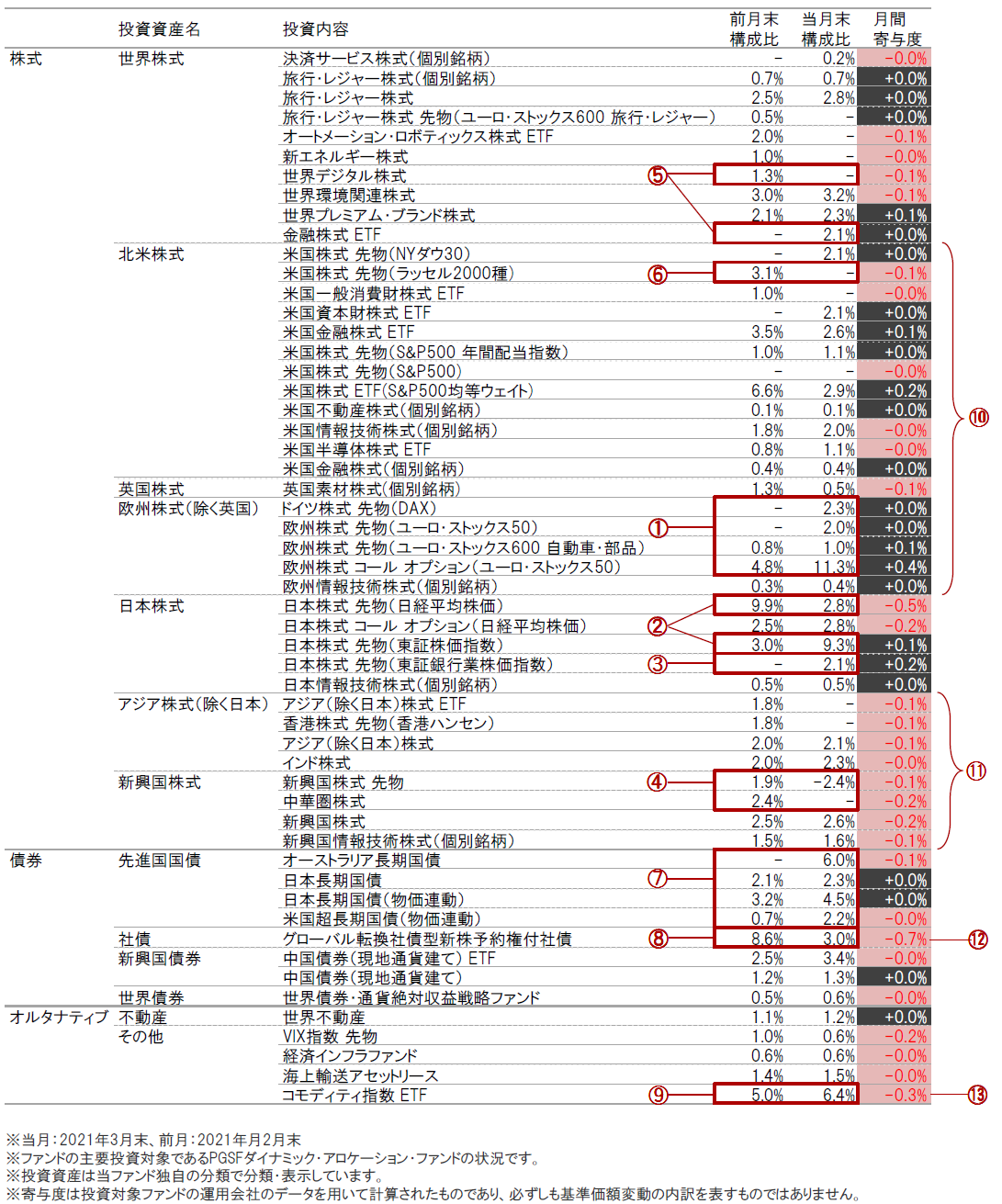 また、世界デジタル株式から金融株式ETFに資金をシフトした(同⑤)ほか、初期段階の景気回復の織り込みが一巡する中で、米国小型株式で構成されるラッセル2000種先物を全売却する(同⑥)などしました。