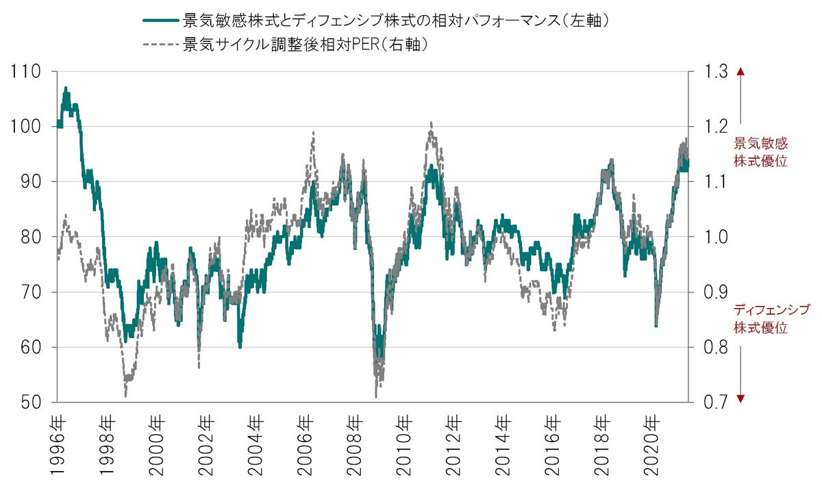 ※景気敏感株式は資本財、素材、一般消費財セクター、ディフェンシブ株式は公益、生活必需品、ヘルスケア、コミュニケーション・サービスセクター。景気サイクル調整後PERはEPSの10年移動平均を使用し算出。