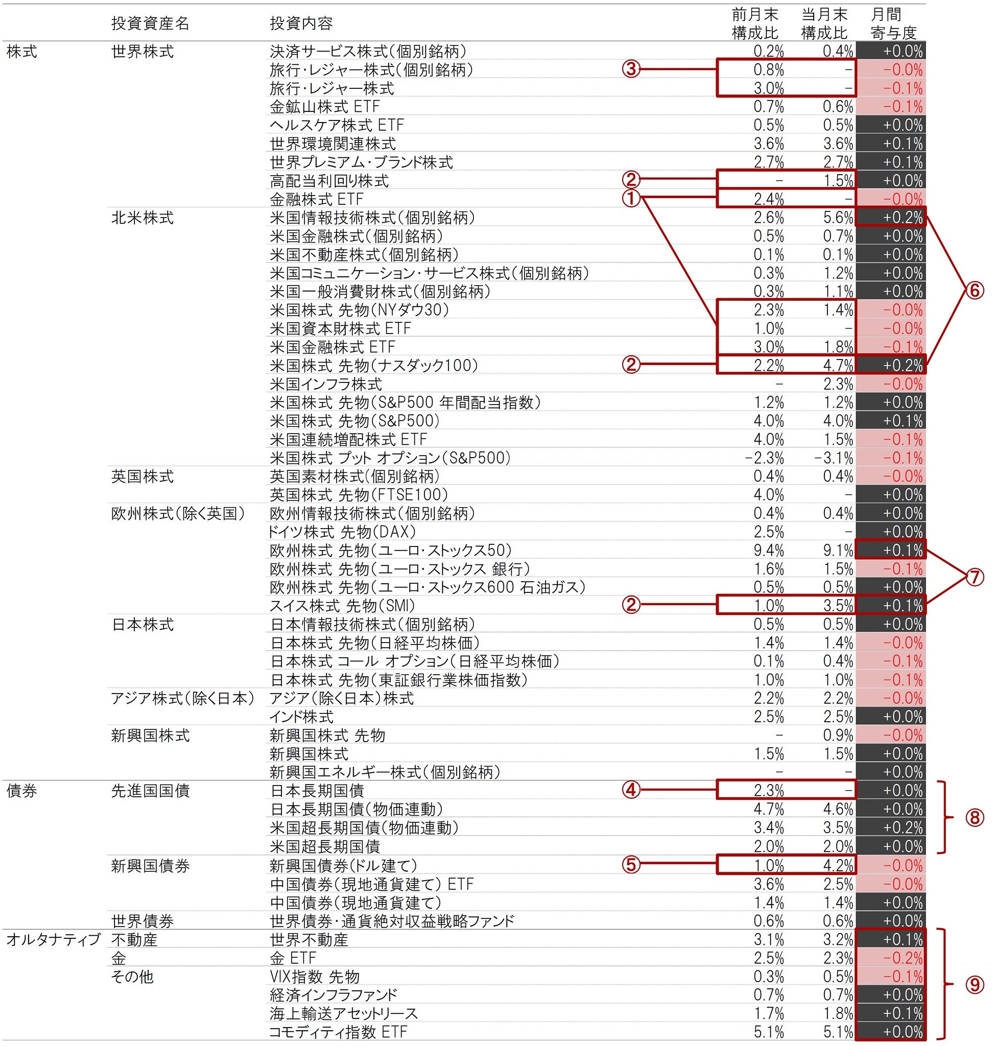 株式部分では、景気モメンタムの鈍化が意識されるなかで、金融株式ETF(世界株式および北米株式)や米国資本財株式ETF、米国株式 先物(NYダウ30)などの景気敏感株式を売却した(図表5-①)一方、米国株式 先物(ナスダック100)などのグロース株式に加え、スイス株式 先物(SMI)や高配当利回り株式などのディフェンシブ株式に資金をシフトしました(同②)。その他、新型コロナウイルス変異株の感染拡大などを受けて、先行き不透明感が高まったことから旅行・レジャー株式を売却しました(同③)。