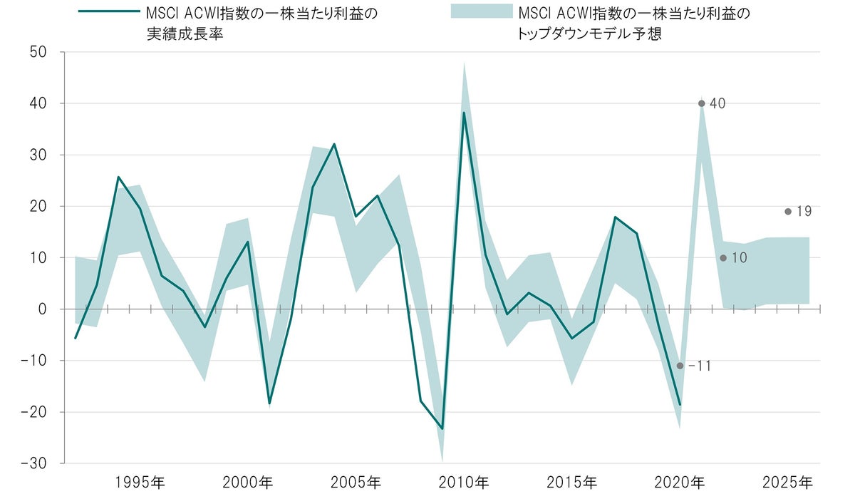 図表6:MSCI ACWI指数の一株当たり利益成長率(実績とピクテ予想)