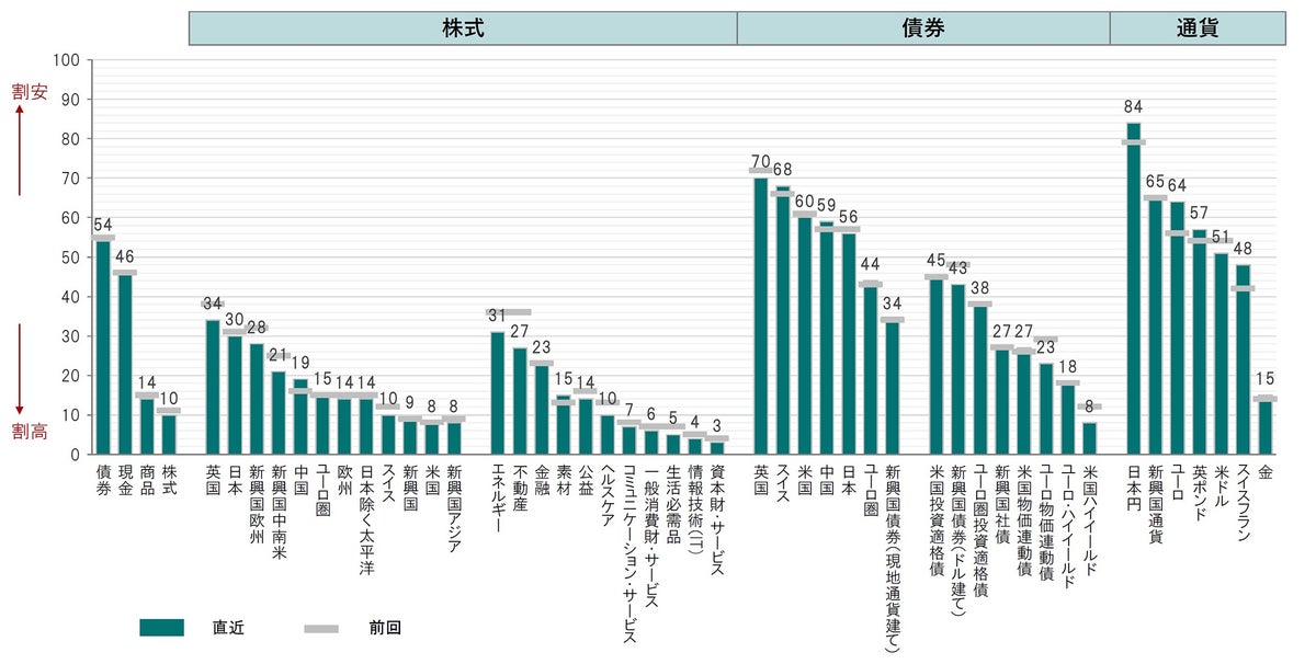 ※株式:株価純資産倍率(PBR)、12ヵ月先株価収益率(PER)、一株あたり利益トレンドベース株価収益率(PER)、株価売上高倍率(PSR)、PEGレシオ、ERP(先進国のみ)、現金、債券:利回りー名目GDPトレンド、商品:ブルームバーグスポット価格インデックス/世界インフレ率、通貨:PPPからの乖離、金:スポット価格/米国消費者物価指数、物価連動債:利回りー実質GDP成長率、新興国通貨建て債券:利回りー消費者物価指数などをもとに作成 各資産のバリュエーション、過去平均(20年)から見た水準:過去20年で何%の水準にあるかを表示