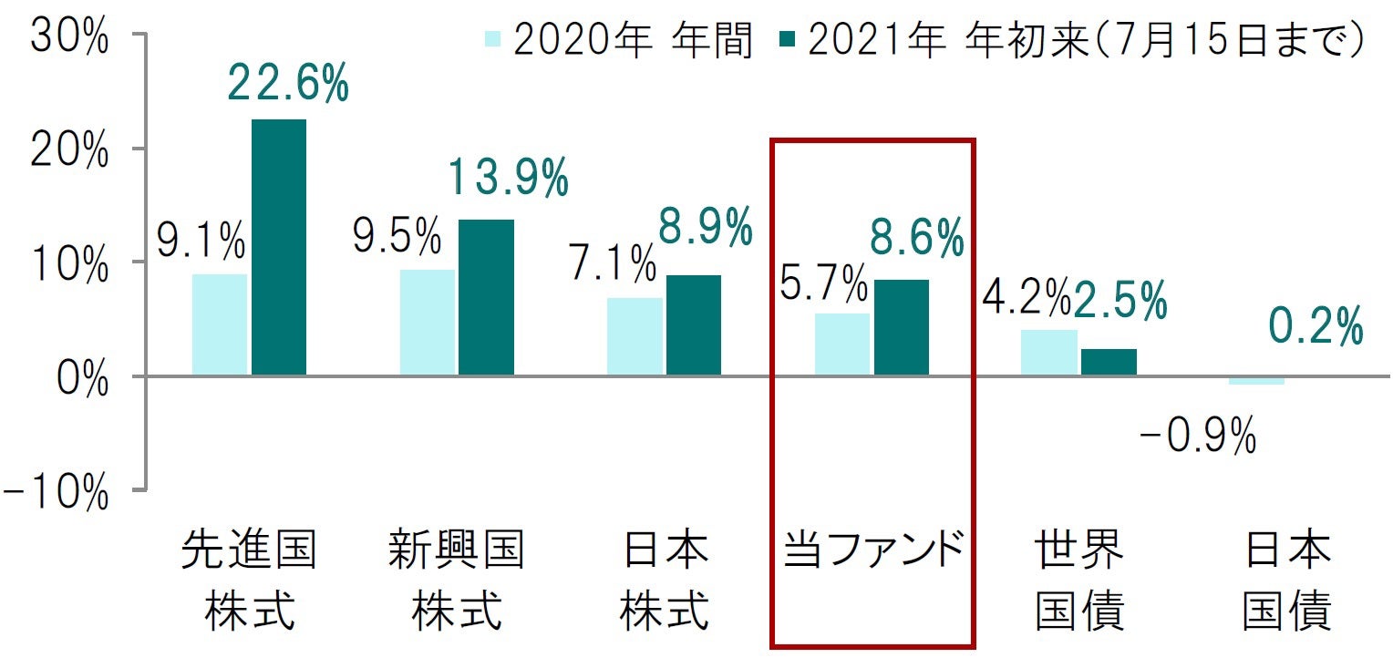図表3:2020年年間、2021年年初来(7月15日まで)の騰落率比較(円換算)