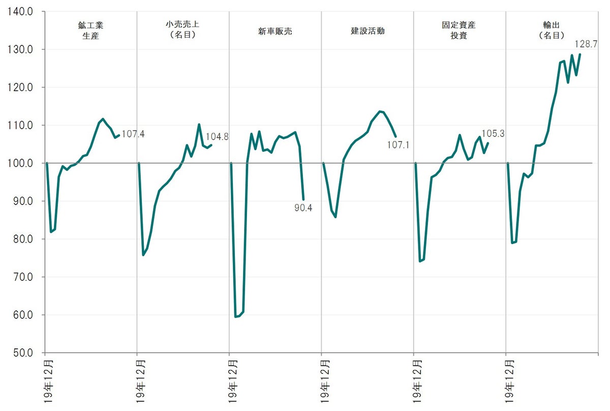 ピクテは中国の6つの経済活動指数を注視していますが、鉱工業生産、小売売上、新車販売、建設活動、固定資産投資、輸出(名目)の6つの指数のうち、輸出(名目)を除いた5つの指数は、足元、いずれも直近ピークを下回って推移しています。