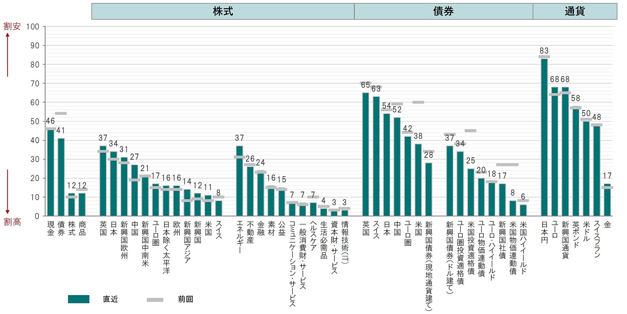 ※株式:株価純資産倍率(PBR)、12ヵ月先株価収益率(PER)、一株あたり利益トレンドベース株価収益率(PER)、株価売上高倍率(PSR)、PEGレシオ、ERP(先進国のみ)、現金、債券:利回りー名目GDPトレンド、商品:ブルームバーグスポット価格インデックス/世界インフレ率、通貨:PPPからの乖離、金:スポット価格/米国消費者物価指数、物価連動債:利回りー実質GDP成長率、新興国通貨建て債券:利回りー消費者物価指数などをもとに作成各資産のバリュエーション、過去平均(20年)から見た水準:過去20年で何%の水準にあるかを表示