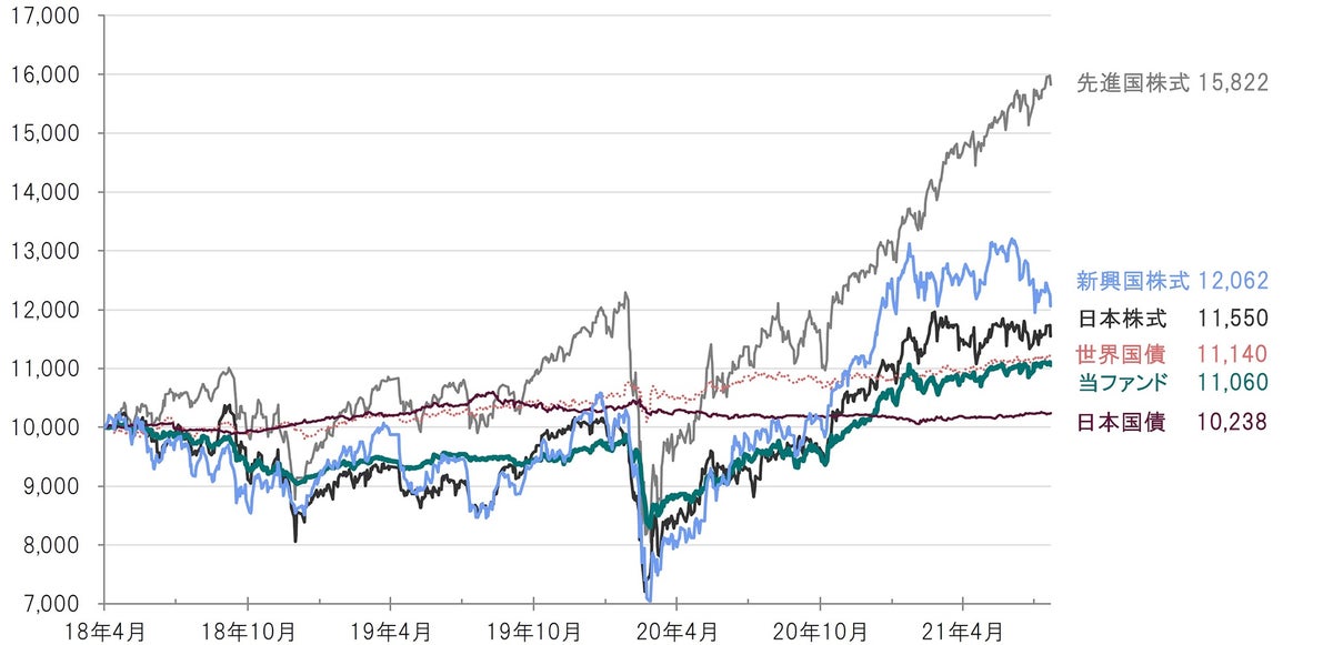 ※当ファンド:当ファンドの基準価額は、実質的な信託報酬等控除後。また、換金時の費用・税金等は考慮しておりません。※先進国株式:MSCI世界株価指数(配当込み)、世界国債:FTSE世界国債指数、新興国株式:MSCI新興国株価指数(配当込み)、日本国債:FTSE日本国債指数、日本株式:TOPIX(配当込み) ※投資対象ファンドによって基準価額に反映する日が1-2日異なるため、比較指数は1営業日前ベースとしています。