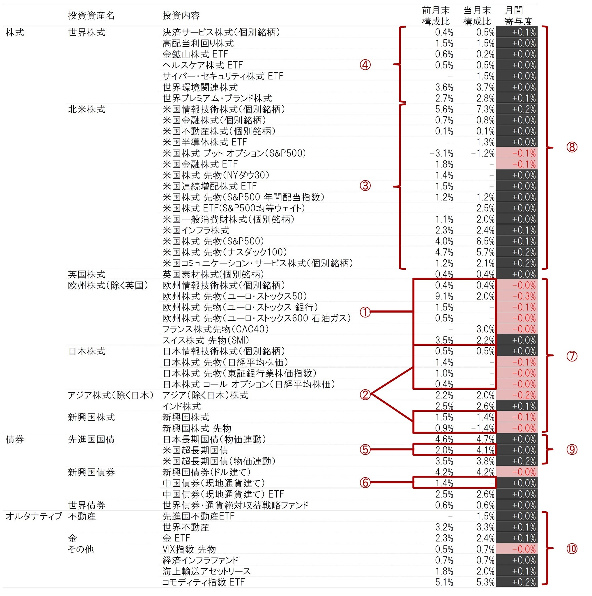 オルタナティブ部分は、VIX指数先物が小幅にマイナス寄与となった以外はコモディティ指数ETFをはじめとして全般にプラス寄与となりました(同⑩)。