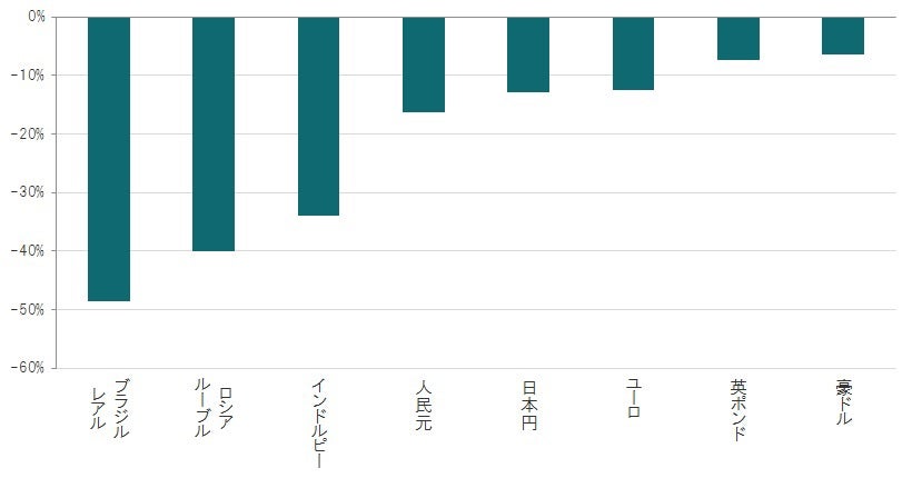 図表3:2020年年間、2021年年初来(8月17日まで)の騰落率比較(円換算)