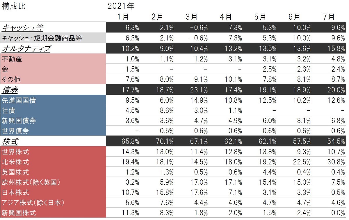 主な投資行動:6月末に続き7月末も株式の組入れを引き下げ