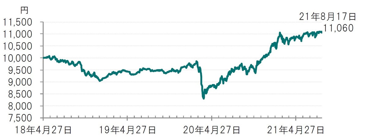 2018年4月27日=10,000として指数化、グラフ右端数値は2021年8月17日時点