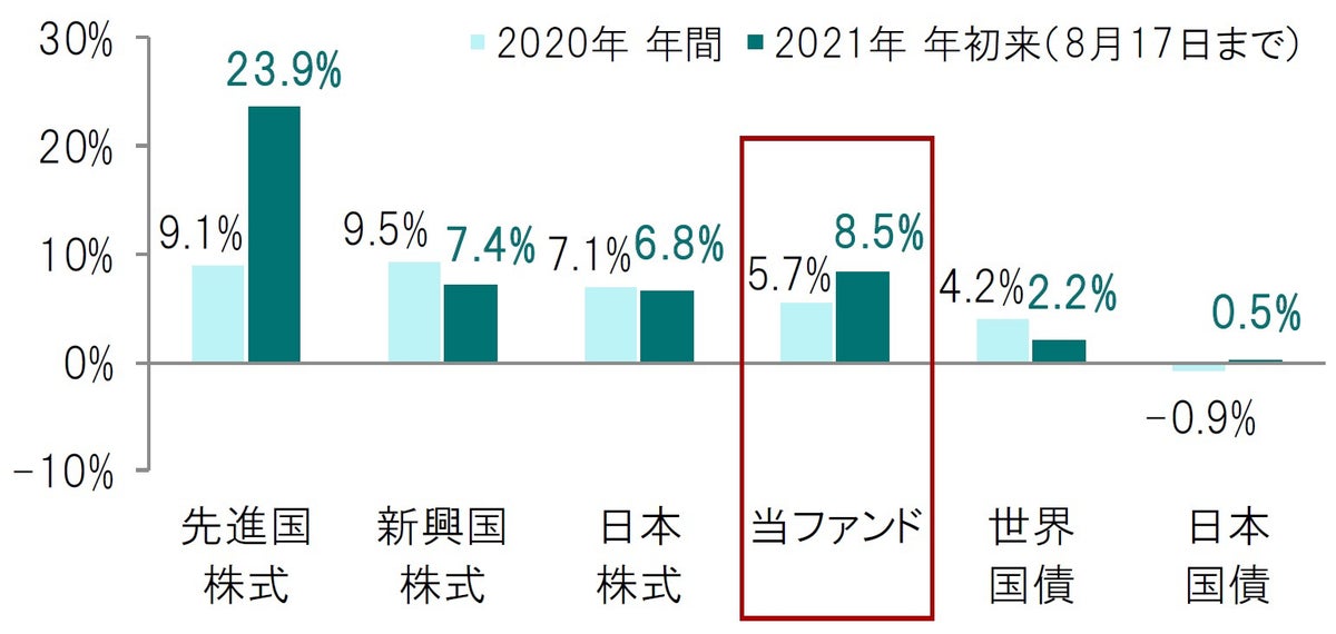 また、アルテの直近2021年8月17日までの年初来の基準価額の騰落率は+8.5%となっており、主に先進国株式やオルタナティブの一部がこれをけん引しました(図表1、2、3)。