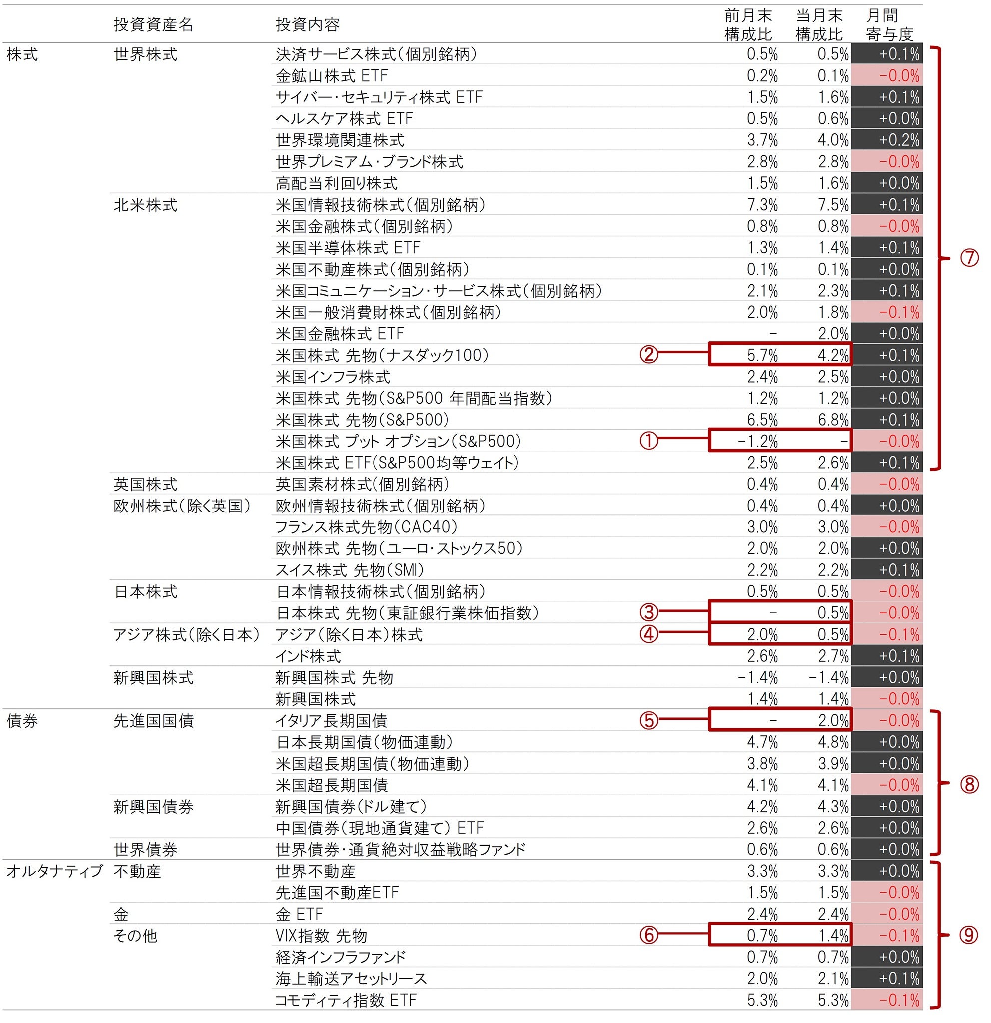一方で、オルタナティブは、海上輸送アセットリースが上昇したものの、VIX指数先物やコモディティ指数ETFなどが下落したことで、全体での寄与は小幅なマイナスとなりました(同⑨)。