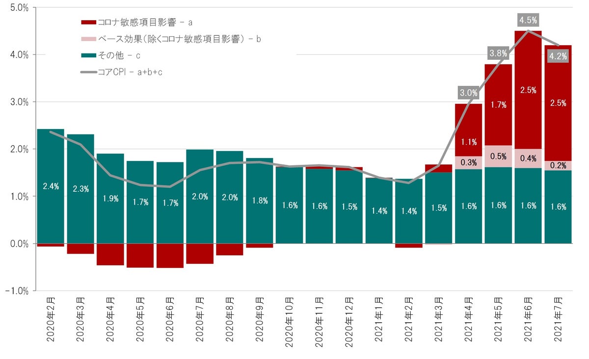 足元の10年国債利回りは1.3%前後と、ピクテのモデルが示唆する適正水準を0.4%前後下回ります。しかしながら、利回りが急上昇する公算は大きくないとみています。これは、現時点では、インフレの高進は一時的であると考えているためです。実際、6月と7月の米国コア消費者物価指数は前年同月比でそれぞれ+4.5%、+4.2%と大きく上昇しましたが、一時的な要因による影響が大きくなっています(図表8)。