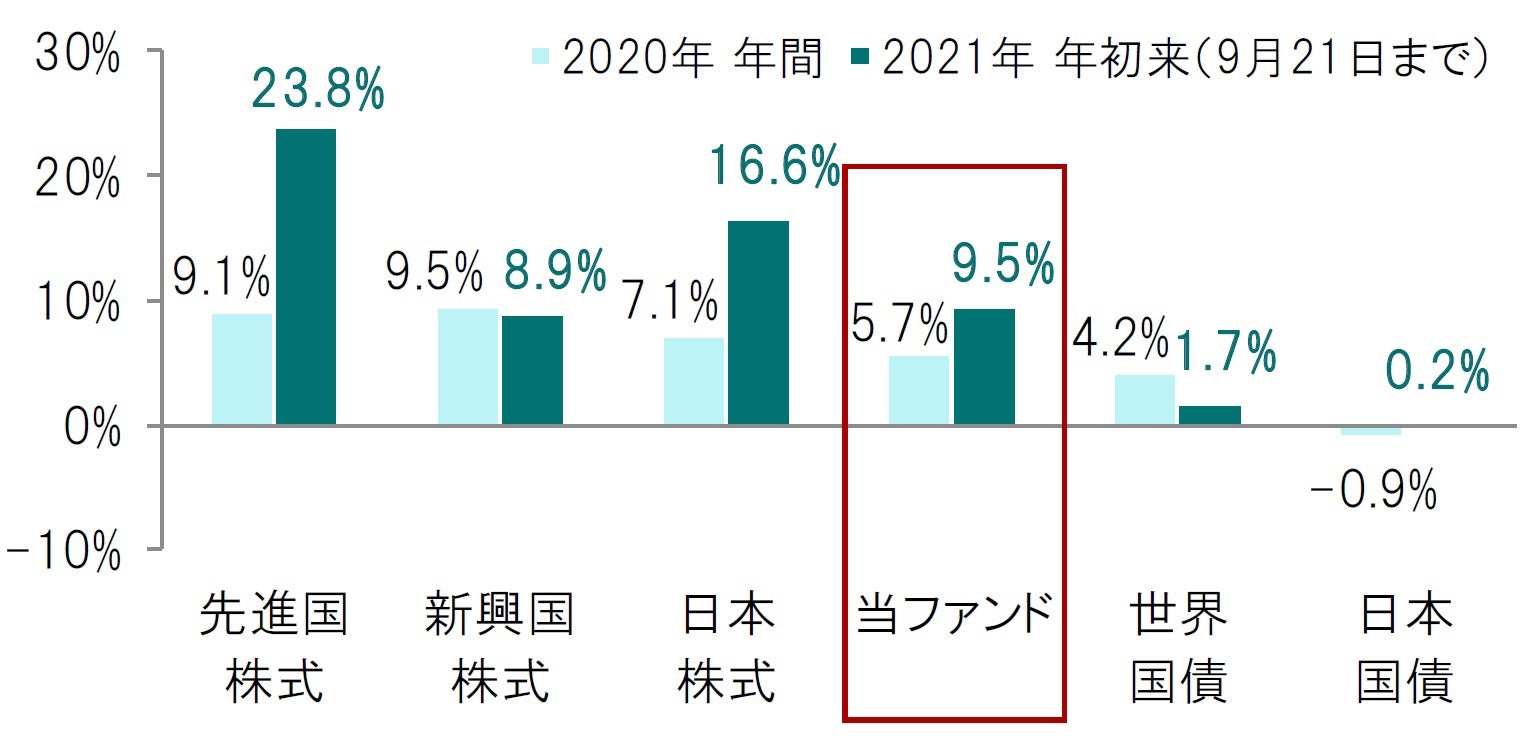 アルテの2021年8月31日の基準価額は、前月末比で+27円(+0.2%)の11,109円となりました。+27円の内訳は、市場要因+61円、為替-22円、その他-13円です。また、アルテの直近2021年9月21日までの年初来の基準価額の騰落率は+9.5%となっており、主に先進国株式がこれをけん引しました(図表1、2、3)。