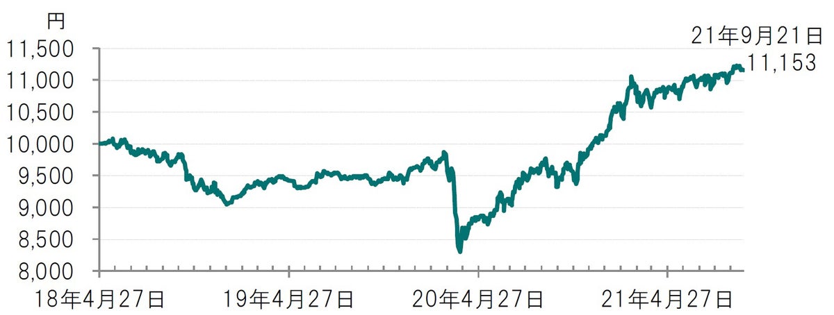 2018年4月27日=10,000として指数化、グラフ右端数値は2021年9月21日時点