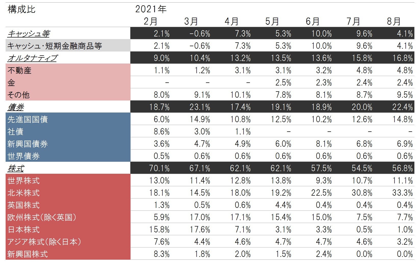 この結果、北米株式の組入比率は3月末の14.5%に対して8月末は33.3%となっています。なお、この間、株式の組入比率は全体として3月末:67.1%→8月末:56.8%と10.3%pt引き下げています。