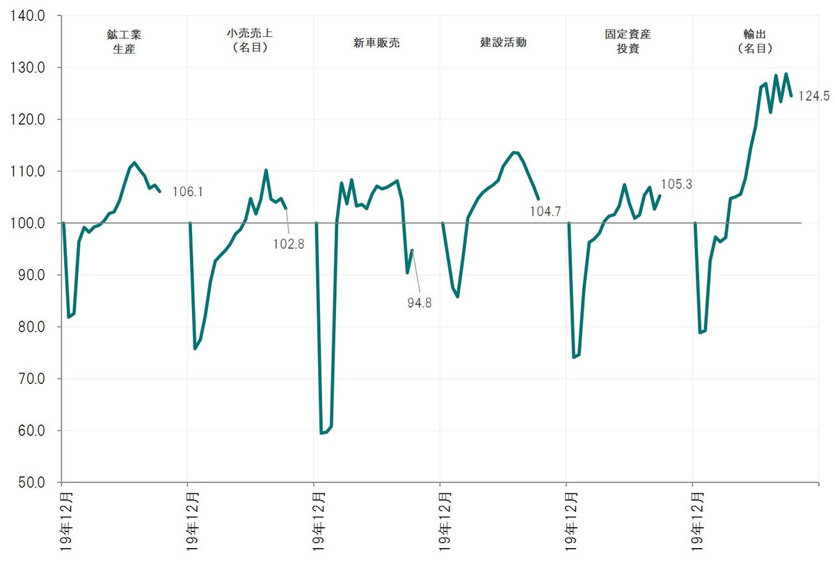 2019年12月~2021年7月:鉱工業生産、小売売上(名目)、新車販売、建設活動、輸出(名目)