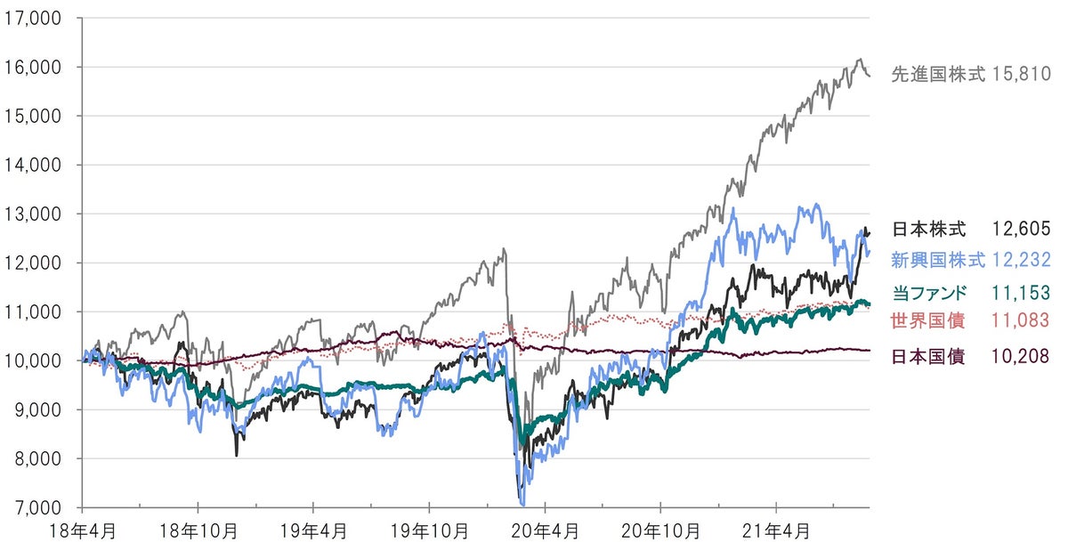 ※当ファンド:当ファンドの基準価額は、実質的な信託報酬等控除後。また、換金時の費用・税金等は考慮しておりません。※先進国株式:MSCI世界株価指数(配当込み)、世界国債:FTSE世界国債指数、新興国株式:MSCI新興国株価指数(配当込み)、日本国債:FTSE日本国債指数、日本株式:TOPIX(配当込み) ※投資対象ファンドによって基準価額に反映する日が1-2日異なるため、比較指数は1営業日前ベースとしています。