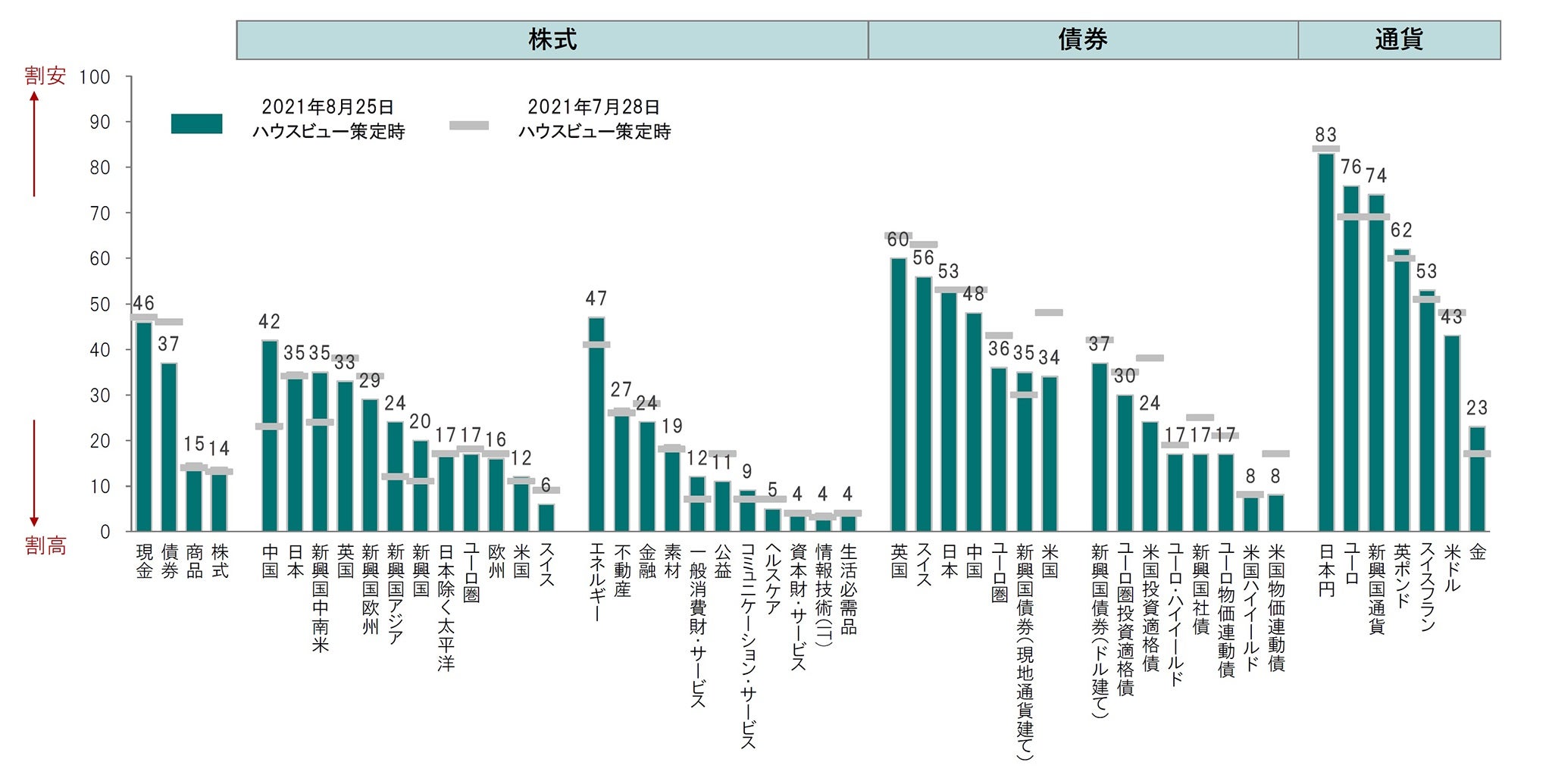 ※株式:株価純資産倍率(PBR)、12ヵ月先株価収益率(PER)、一株あたり利益トレンドベース株価収益率(PER)、株価売上高倍率(PSR)、PEGレシオ、ERP(先進国のみ)、現金、債券:利回りー名目GDPトレンド、商品:ブルームバーグスポット価格インデックス/世界インフレ率、通貨:PPPからの乖離、金:スポット価格/米国消費者物価指数、物価連動債:利回りー実質GDP成長率、新興国通貨建て債券:利回りー消費者物価指数などをもとに作成 各資産のバリュエーション、過去平均(20年)から見た水準:過去20年で何%の水準にあるかを表示