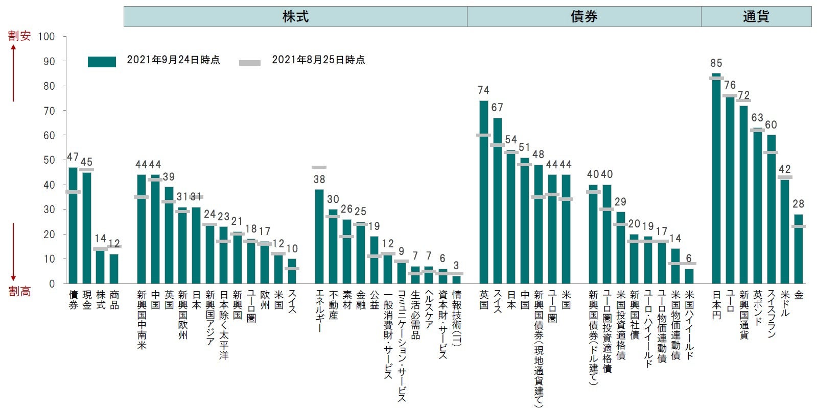 ※株式:株価純資産倍率(PBR)、12ヵ月先株価収益率(PER)、一株あたり利益トレンドベース株価収益率(PER)、株価売上高倍率(PSR)、PEGレシオ、ERP(先進国のみ)、現金、債券:利回りー名目GDPトレンド、商品:ブルームバーグスポット価格インデックス/世界インフレ率、通貨:PPPからの乖離、金:スポット価格/米国消費者物価指数、物価連動債:利回りー実質GDP成長率、新興国通貨建て債券:利回りー消費者物価指数などをもとに作成各資産のバリュエーション、過去平均(20年)から見た水準:過去20年で何%の水準にあるかを表示
