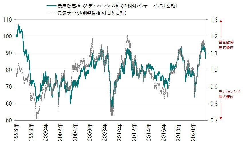 ※景気敏感株式は資本財、素材、一般消費財セクター、ディフェンシブ株式は公益、生活必需品、ヘルスケア、コミュニケーション・サービスセクター。景気サイクル調整後PERはEPSの10年移動平均を使用し算出。
