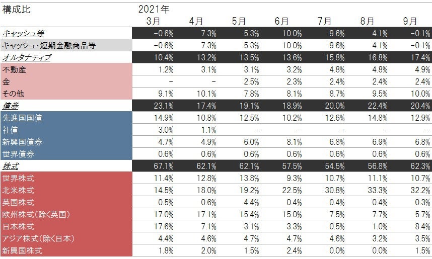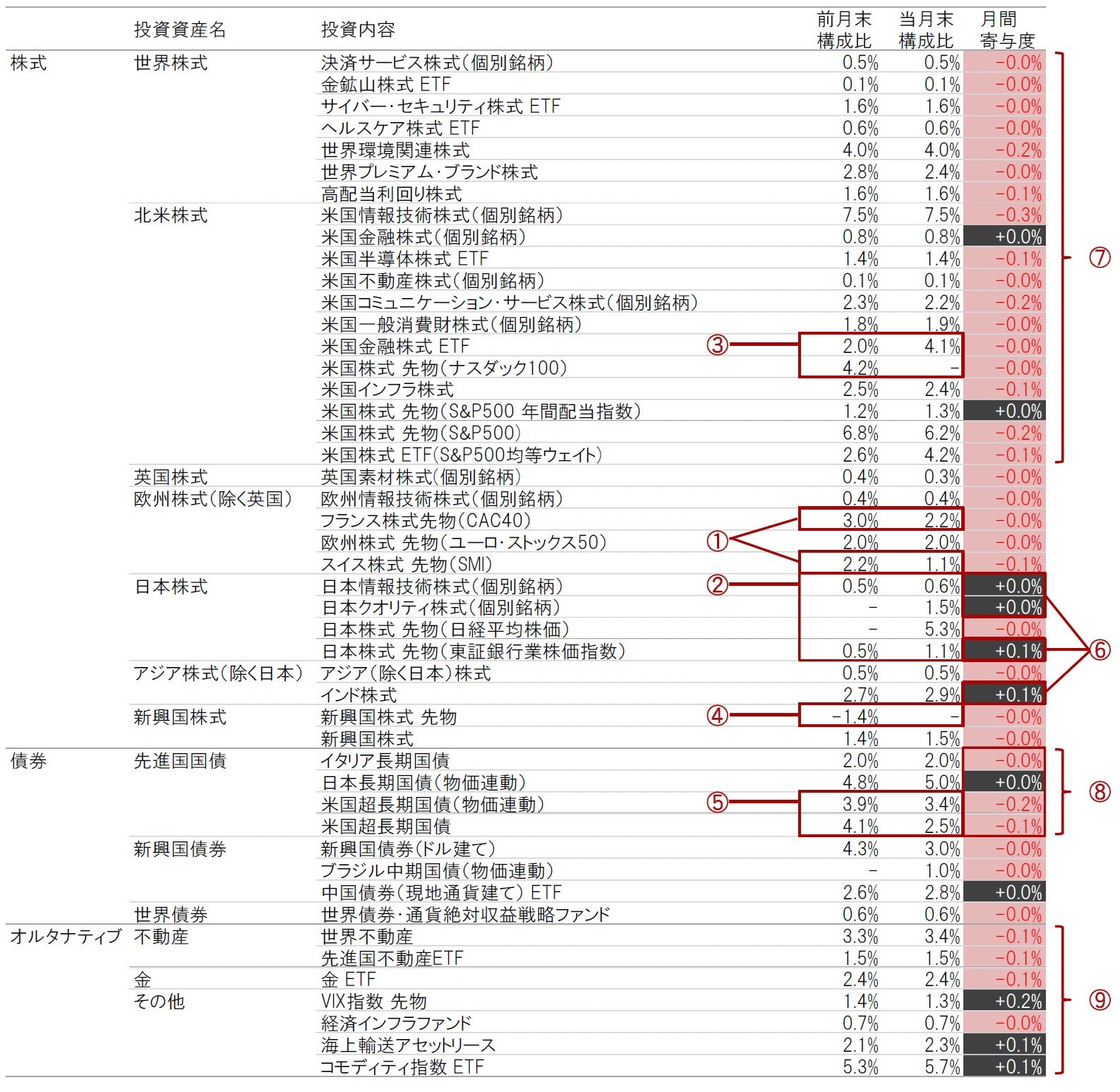 一方で、オルタナティブは、金利上昇を背景に金や不動産が下落した一方で、VIX指数先物や海上輸送アセットリースなどが上昇し、全体での寄与はプラスとなりました(同⑨)。
