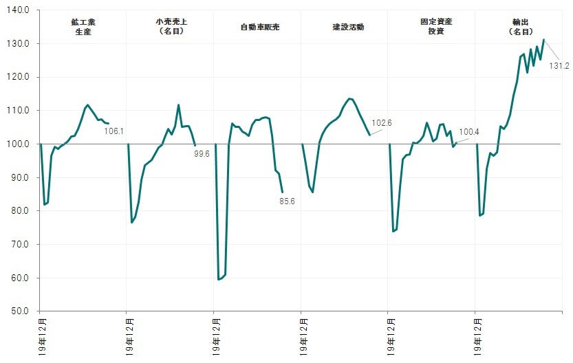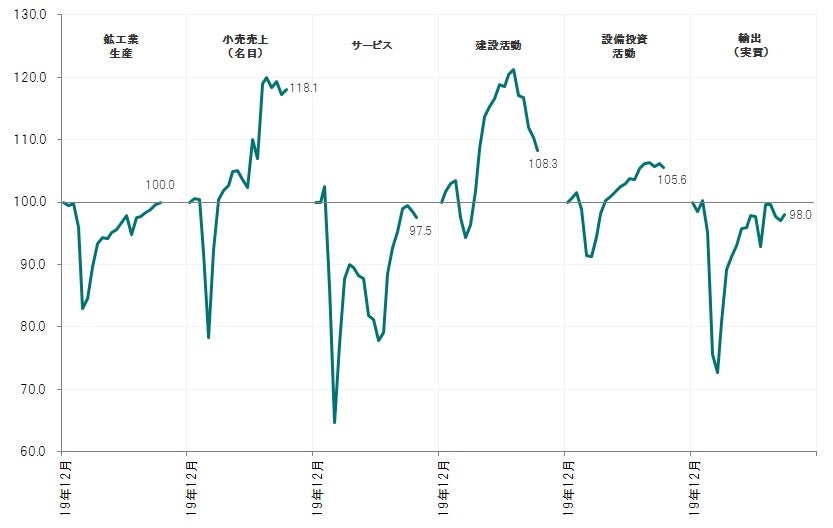 ※データの表示期間は以下の通り。2019年12月~2021年7月:輸出(実質)、2019年12月~2021年8月:鉱工業生産、小売売上(名目)、建設活動、設備投資活動、2019年12月~2021年9月:サービス。