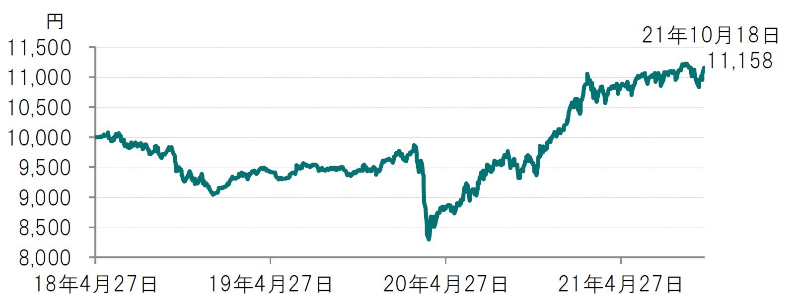 2018年4月27日=10,000として指数化、グラフ右端数値は2021年10月18日時点