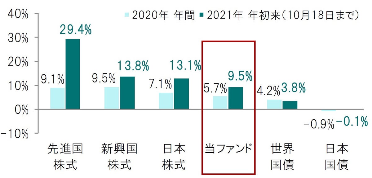 アルテの2021年9月30日の基準価額は、前月末比で-119円(-1.1%)の10,990円となりました。-119円の内訳は、市場要因-116円、為替+9円、その他-12円です。また、アルテの直近2021年10月18日までの年初来の基準価額の騰落率は+9.5%となっており、主に先進国株式がこれをけん引しました(図表1、2、3)。