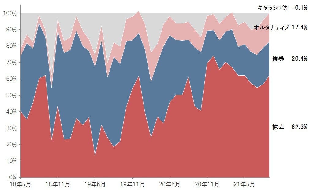 世界経済の回復は依然継続しているものの、供給サイドにおける混乱が長期化しており、世界中でインフレ高進が懸念されています。そうしたなか、金利が一段と上昇する可能性が警戒されていることから、当ポートフォリオにおいては株式、債券ともに金利上昇に耐えうる銘柄を選択し、当面の不安定な環境に備える方針です。