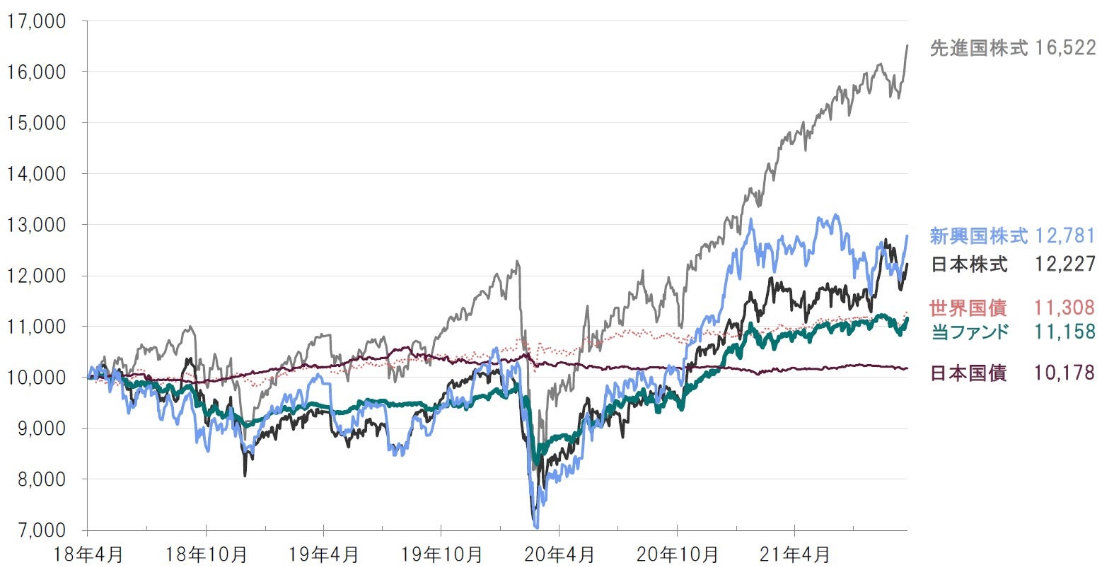 ※当ファンド:当ファンドの基準価額は、実質的な信託報酬等控除後。また、換金時の費用・税金等は考慮しておりません。※先進国株式:MSCI世界株価指数(配当込み)、世界国債:FTSE世界国債指数、新興国株式:MSCI新興国株価指数(配当込み)、日本国債:FTSE日本国債指数、日本株式:TOPIX(配当込み) ※投資対象ファンドによって基準価額に反映する日が1-2日異なるため、比較指数は1営業日前ベースとしています。