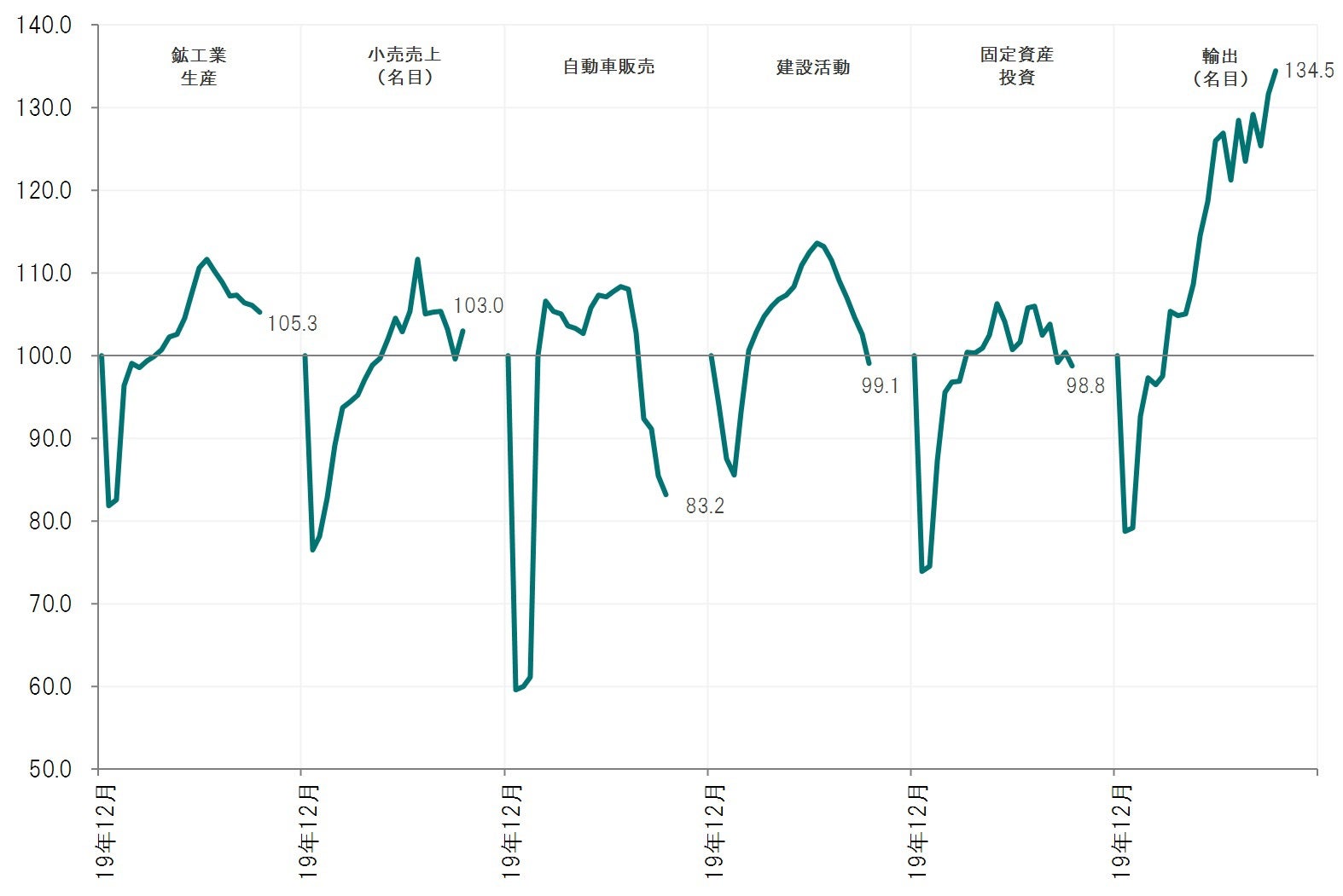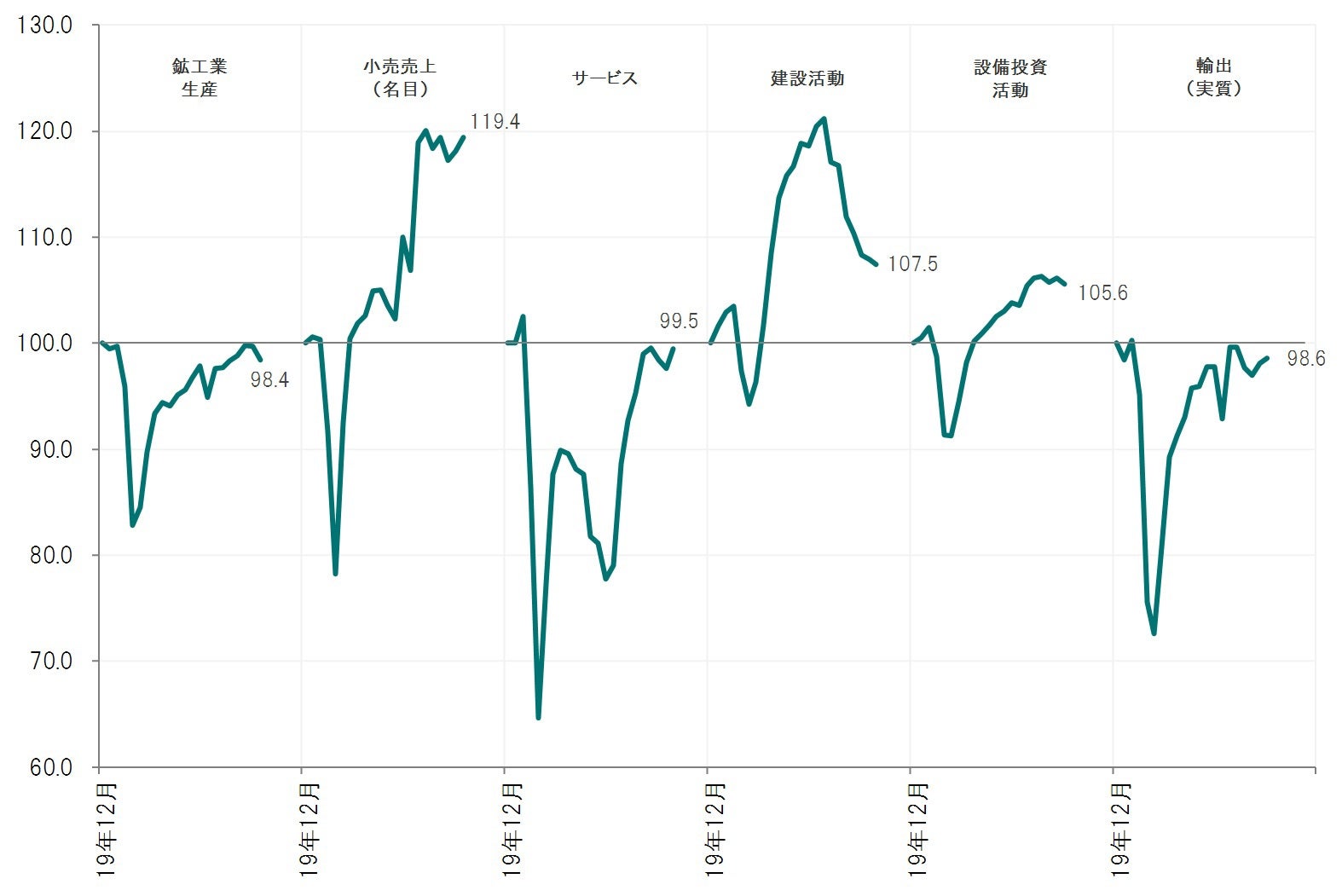 ※データの表示期間は以下の通り。2019年12月~2021年8月:設備投資活動、輸出(実質)、2019年12月~2021年9月:鉱工業生産、小売売上(名目)、2019年12月~2021年10月:サービス、建設活動。