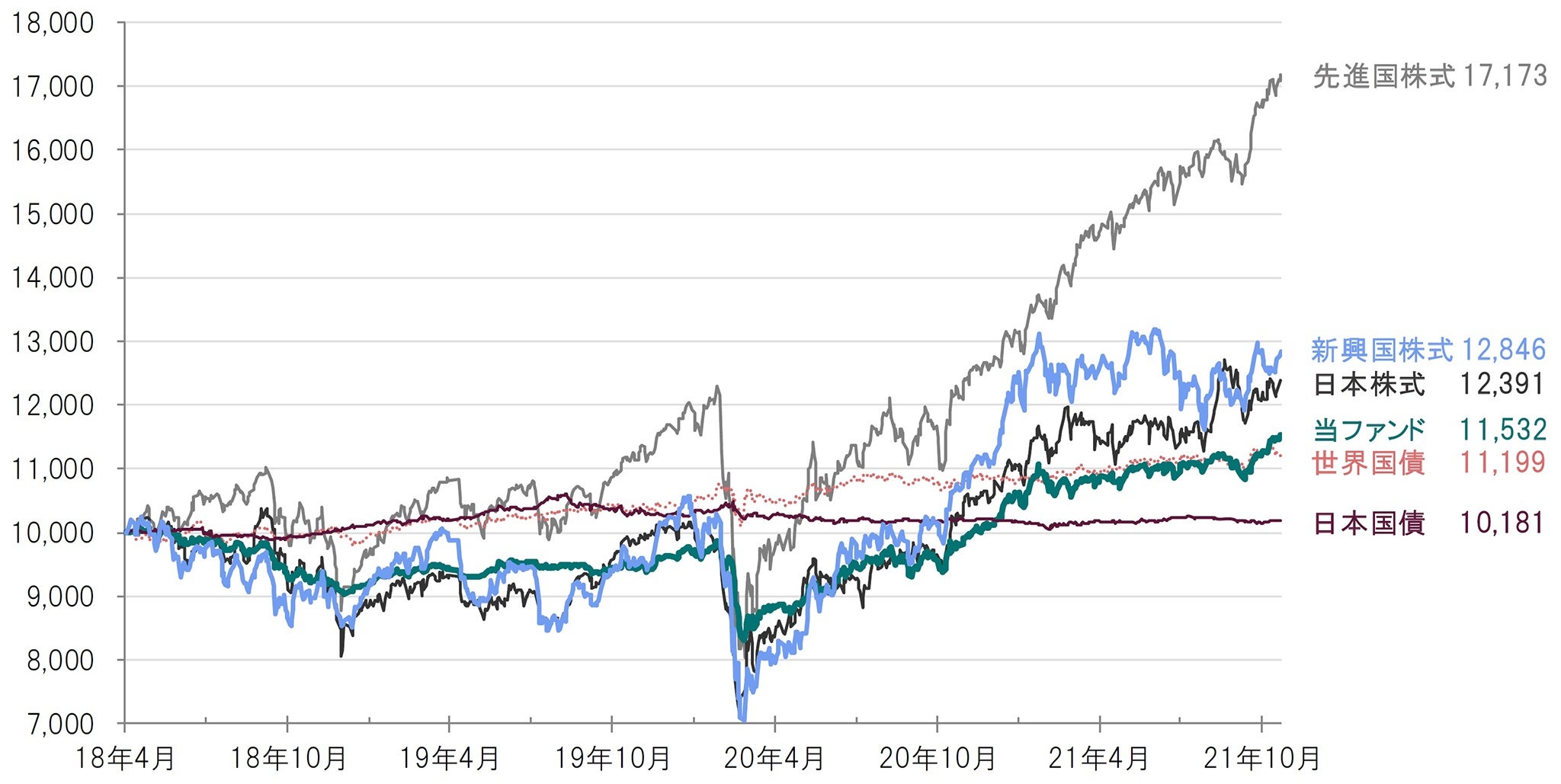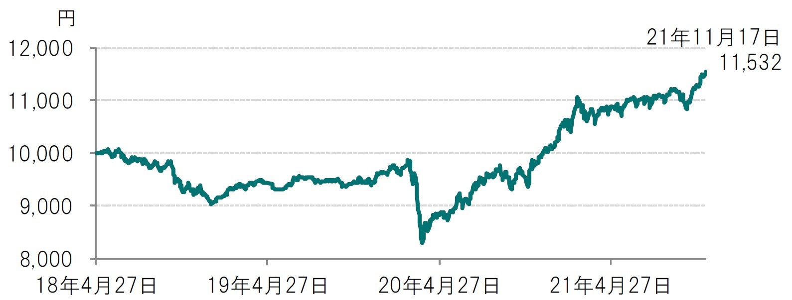 2018年4月27日=10,000として指数化、グラフ右端数値は2021年11月17日時点