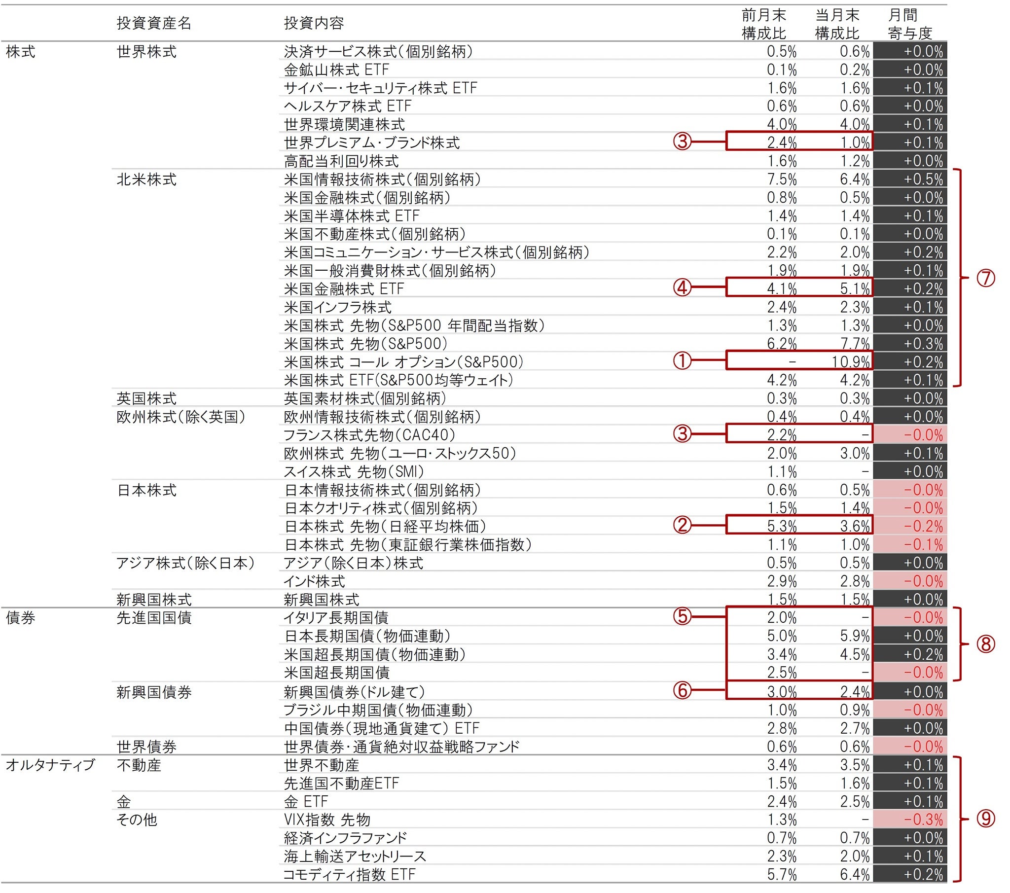 オルタナティブは、VIX指数先物がマイナス寄与となったものの、コモディティ指数ETFや不動産などが上昇したことから、全体としてはプラス寄与となりました(同⑨)。