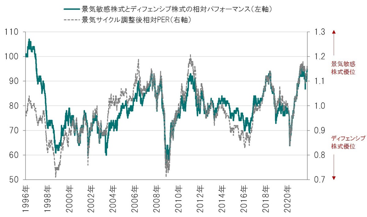 ※景気敏感株式は資本財、素材、一般消費財セクター、ディフェンシブ株式は公益、生活必需品、ヘルスケア、コミュニケーション・サービスセクター。景気サイクル調整後PERはEPSの10年移動平均を使用し算出。