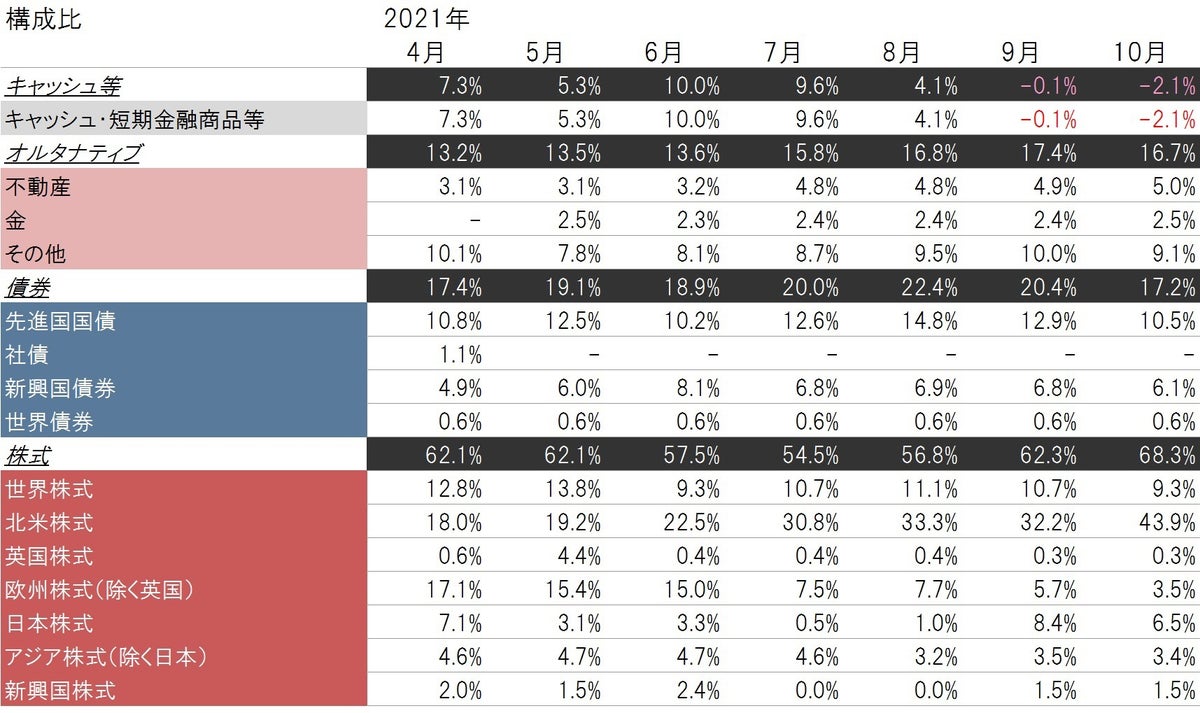 世界経済は、供給サイドの混乱が懸念されるものの、トレンドを上回るペースの経済成長が当面継続するとみています。また、インフレ期待が高止まりするなか、高い名目経済成長が企業業績を押し上げる可能性があるため、慎重ながら株式の組入比率を引き上げました。一方、金利先高感が継続していることから債券の組入比率は抑制しました。