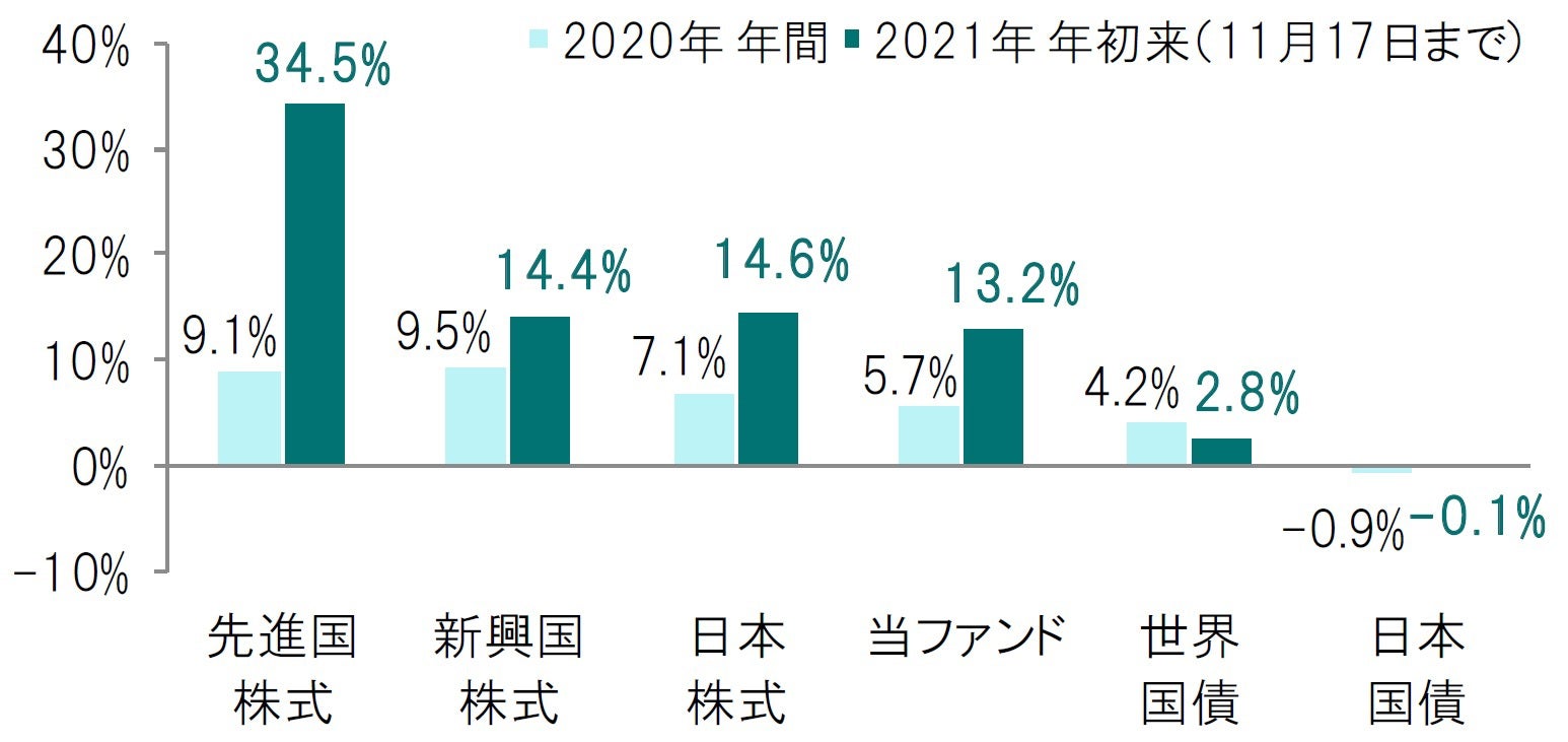 アルテの2021年10月29日の基準価額は、前月末比で+277円(+2.5%)の11,267円となりました。+277円の内訳は、市場要因+279円、為替+10円、その他-12円です。また、アルテの直近2021年11月17日までの年初来の基準価額の騰落率は+13.2%となっており、主に先進国株式がこれをけん引しました(図表1、2、3)。