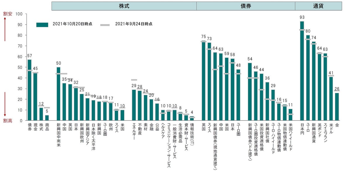 ※株式:株価純資産倍率(PBR)、12ヵ月先株価収益率(PER)、一株あたり利益トレンドベース株価収益率(PER)、株価売上高倍率(PSR)、PEGレシオ、株式リスクプレミアム(先進国のみ)、現金、債券:利回りー名目GDPトレンド、商品:ブルームバーグスポット価格インデックス/世界インフレ率、通貨:PPP(購買力平価)からの乖離、金:スポット価格/米国消費者物価指数、物価連動債:利回りー実質GDP成長率、新興国通貨建て債券:利回りー消費者物価指数などをもとに作成各資産のバリュエーション、過去平均(20年)から見た水準:過去20年で何%の水準にあるかを表示