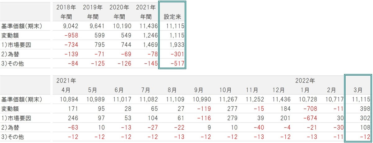 2022年3月31日の基準価額は11,115円となり、前月末に対して398円上昇しました。要因別の内訳は、市場要因+302円、為替+108円、その他(信託報酬等)-12円です。