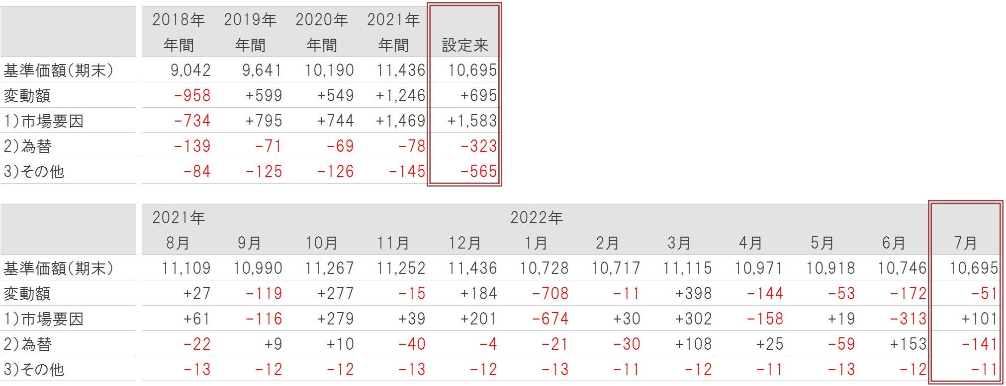 2022年7月29日の基準価額は10,695円となり、前月末に対して51円下落しました。要因別の内訳は、市場要因+101円、為替-141円、その他(信託報酬等)-11円です。