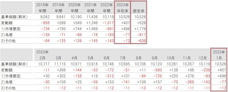 2023年1月31日の基準価額は10,526円となり、前月末に対して407円上昇しました。要因別の内訳は、市場要因+496円、為替-77円、その他(信託報酬等)-12円です。
