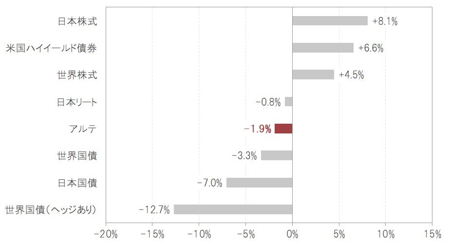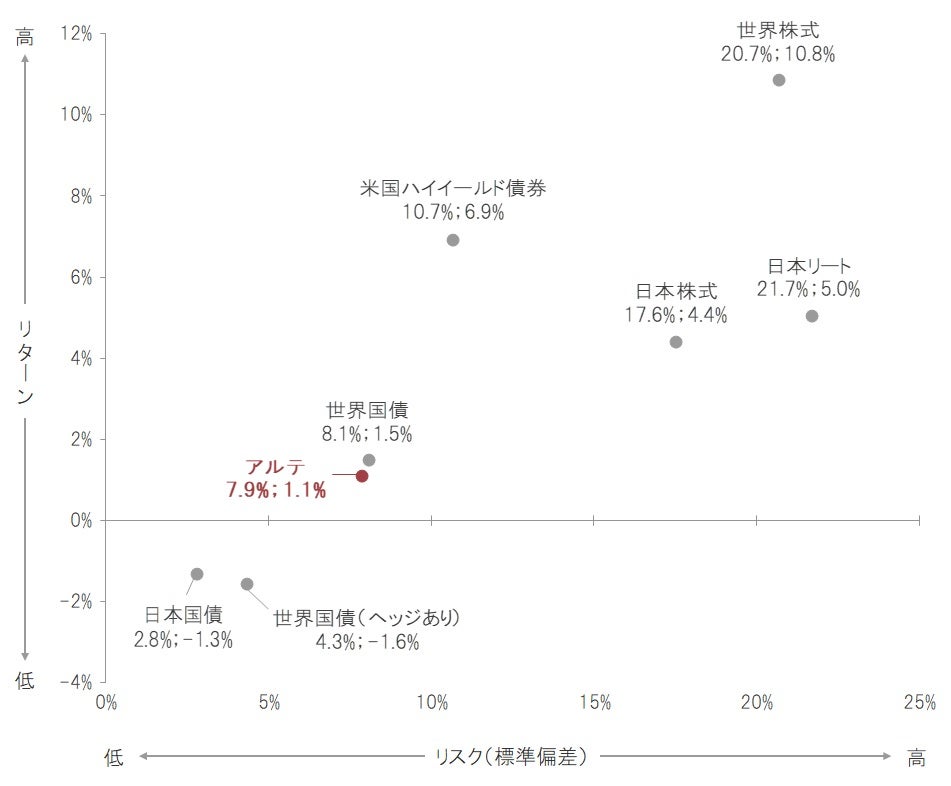 アルテの設定来の年率のリスク(標準偏差)とリターンはそれぞれ7.9%、1.1%となっています。