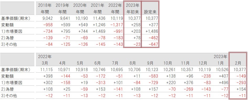 2023年2月28日の基準価額は10,377円となり、前月末に対して149円下落しました。要因別の内訳は、市場要因-293円、為替+154円、その他(信託報酬等)-11円です。